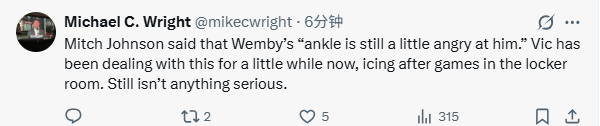 米奇-约翰逊表示:“文班亚马的脚踝有些不舒服,他已经受这个问题困扰有一阵子了,每场比赛结束后也会在更衣室冰敷。虽然文班亚马缺席了比赛,但他的情况依然不算严重。”