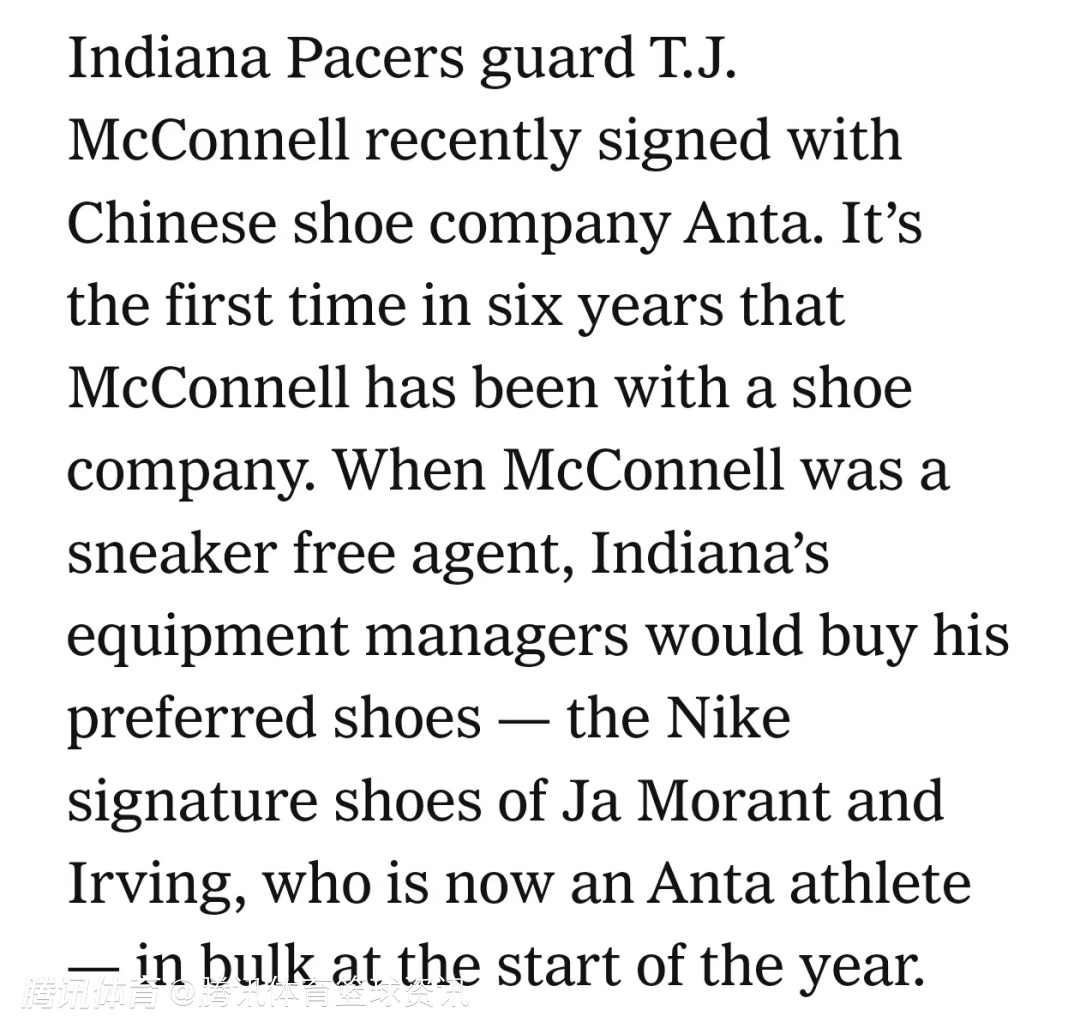北京时间4月3日,根据TA记者詹姆斯-爱德华兹的报道,印第安纳步行者后卫 麦康奈尔近日与中国运动品牌安踏签约。这是麦康奈尔时隔六年再度拥有球鞋代言合同。
