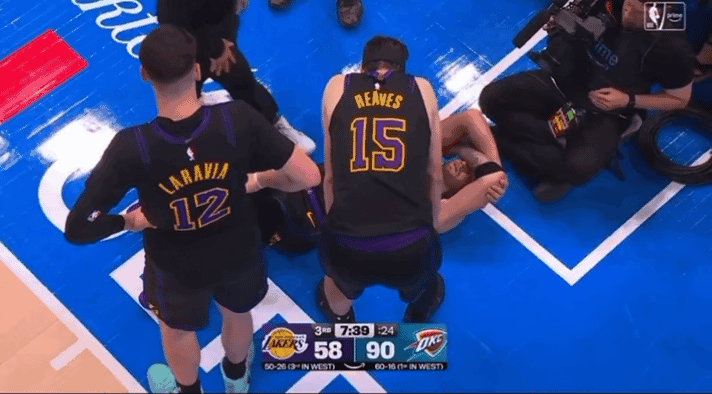 第三节比赛还剩下7分多钟的时候,东契奇在持球突破后,身体抽了一下,随后他一瘸一拐地转身走路,然后捂脸躺在地上,湖人随后请求暂停,东契奇起身回到替补席,之后返回更衣室。