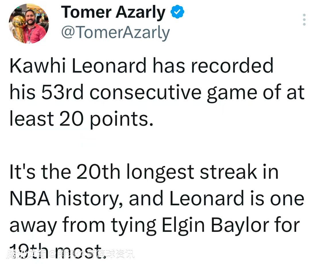 比赛进行至第三节时,莱昂纳德连续干拔三分得到本场21分,已连续53场砍下20+。根据数据统计显示,这一纪录位列NBA历史第20长,莱昂纳德再拿1场20+,就能追平埃尔金-贝勒,升至历史第19位。
