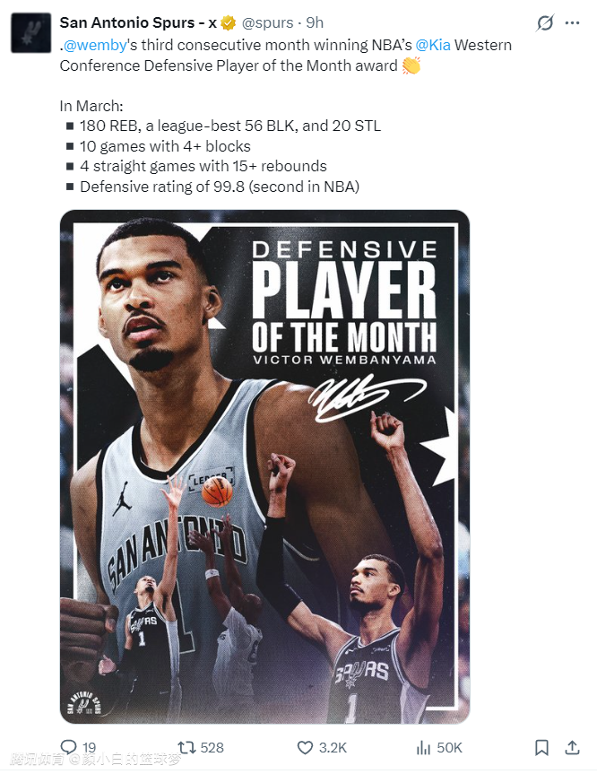 这场比赛之前NBA官方公布了月最佳防守球员,文班亚马180篮板56盖帽20抢断,有10场比赛至少4封盖,连续4场比赛篮板15+,防守效率99.8联盟第二。但这场对阵快船的比赛文班亚马不会登场。(本赛季61场比赛还差4场评奖)