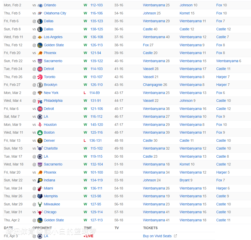 北京时间4月3日,NBA常规赛,马刺大胜快船拿到11连胜,最近的29场比赛马刺赢下其中的27场。这场比赛马刺最多领先快船26分,虽然快船一度追到个位数,末节马刺又一波流拉开分差,没有文班亚马也拿到背靠背胜利。