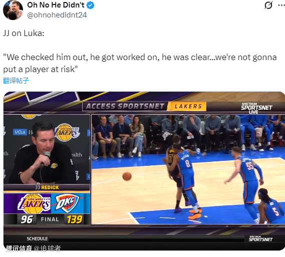赛后谈到东契奇腿筋受伤,湖人主帅雷迪克透露,东契奇在上半场就拉伤了腿筋,经过诊断后被允许下半场获准上场;对此雷迪克表示:我们检查了他的情况,他也接受了治疗,而且队医评估后,确认他可以继续打。我们不会把球员置于风险之中,但这种事情有时候就是会发生。