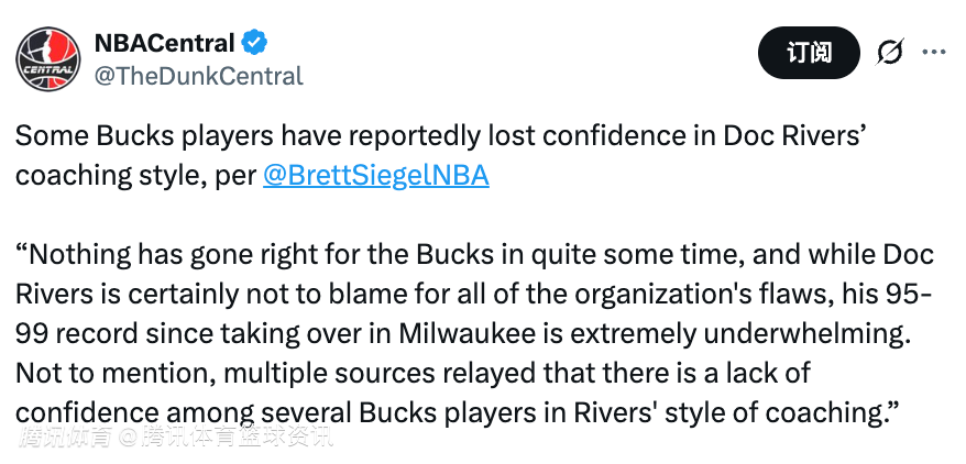 北京时间4月4日,据美记Brett Siegel报道,部分雄鹿球员已经对里弗斯的执教风格失去信心。