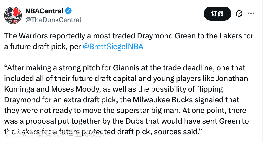 Siegel表示:“在交易截止日前,勇士为得到字母哥开出了极具诚意的报价,筹码包括全部未来选秀资产、库明加和穆迪等年轻球员,甚至还计划通过交易追梦来额外换取一个选秀权。但雄鹿方面明确表示,他们暂时没有送走这位超级球星的打算。消息人士透露,勇士曾一度提出一份方案,计划将格林送往湖人,换回一个受保护的未来选秀权。”