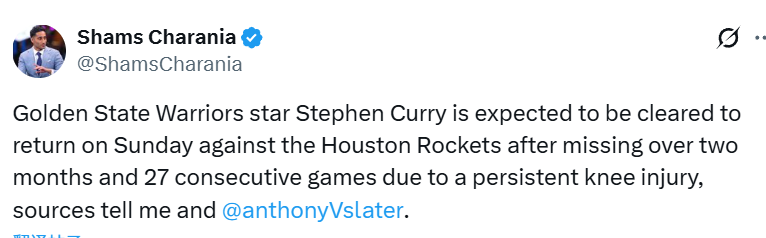 此次休战时间比库里最初预期要久。1月31日勇士不敌底特律活塞的比赛中,他因右膝疼痛肿胀离场。之后两个月里,库里多次尝试加大训练量以回归赛场,却一直出现伤情反复。不过近几周他的膝盖恢复状况良好,本周在勇士旧金山训练馆完成两场5对5对抗训练后,已通过全部医疗评估。他将在周日随队合练,并将在下周一对阵休斯顿火箭的比赛中登场。