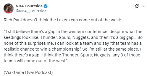 北京时间4月4日,知名经纪人里奇-保罗在播客节目中表示,他并不看好湖人在季后赛的前景。