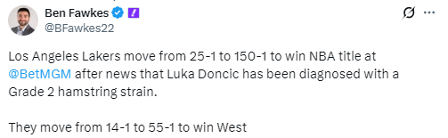 在东契奇被确诊为二级腿筋拉伤的消息传出后,博彩公司BetMGM立刻更新了相关赔率:
