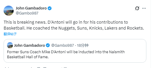北京时间4月4日,据太阳队记John Gambadoro爆料,前太阳队主帅迈克-德安东尼将入选奈史密斯篮球名人堂。