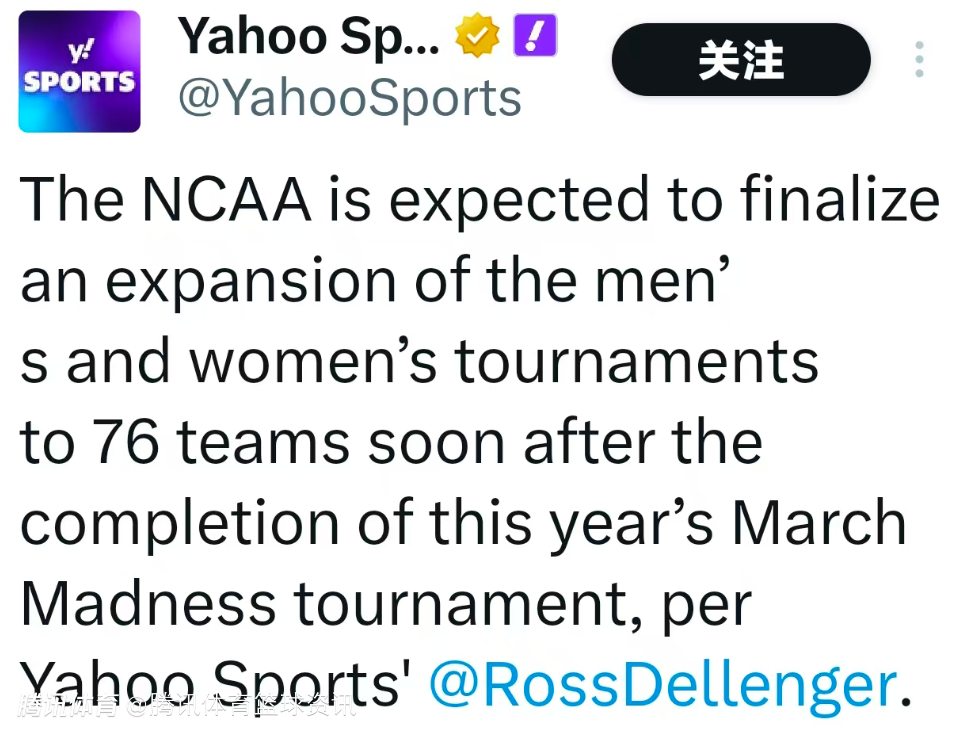 北京时间4月4日,据雅虎体育记者Ross Dellenger报道,NCAA 预计将在今年“疯狂三月”赛事结束后不久,正式敲定男女篮球锦标赛扩至76支球队的方案。