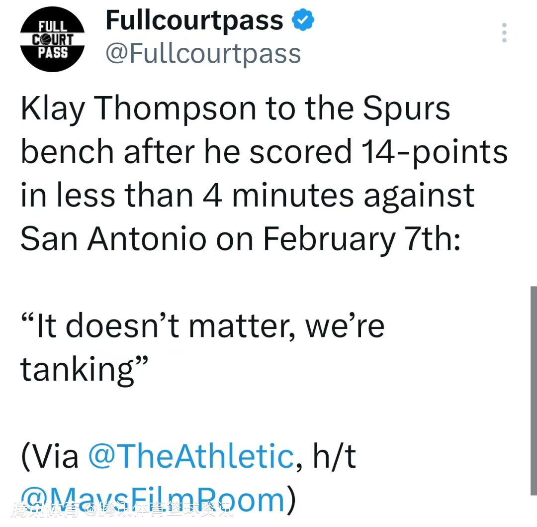 今年2月独行侠对阵马刺的比赛里,克莱在第二节手感爆发,不到4分钟便轰下14分。在这波得分攻势中,克莱还对着马刺替补席喊话:“没事,我们正在摆烂。”
