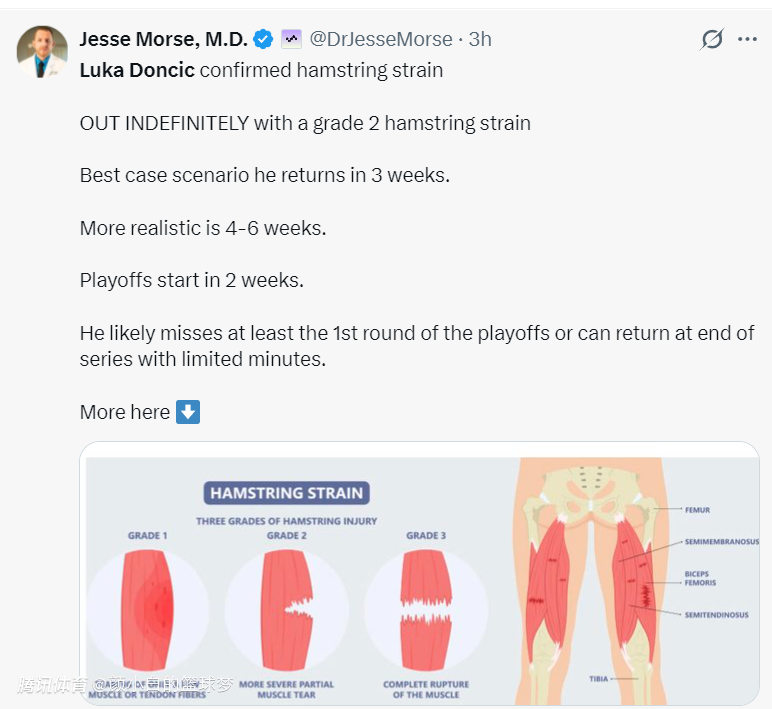 根据美媒LH的说法,东契奇腿筋二级拉伤,一般都是5周的康复期,湖人季后赛首轮、次轮都不一定能打。