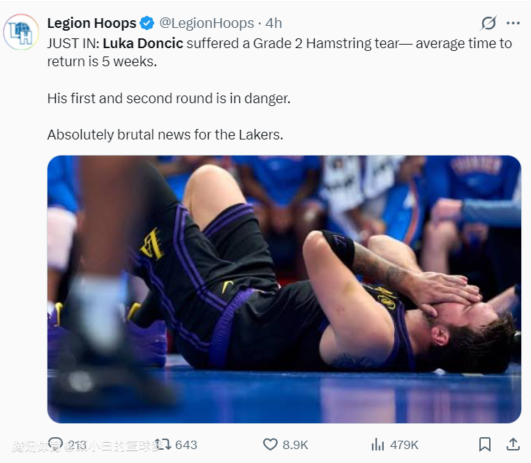 为什么森林狼想留在西部第六?答案就是洛杉矶湖人队的头号球星卢卡-东契奇遭遇了左侧腿筋二级拉伤,这个伤势是可能让湖人整个赛季白玩的大伤,二级拉伤至少需要3-6周才能康复,平均缺席35天约14.7场比赛,季后赛在两周后就要开打了。