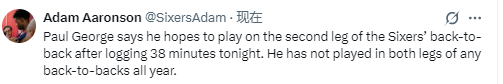 乔治表示,今晚出战38分钟后,他希望能出战76人队背靠背的第二场比赛。本赛季他还从未在背靠背的两场比赛中都登场过。