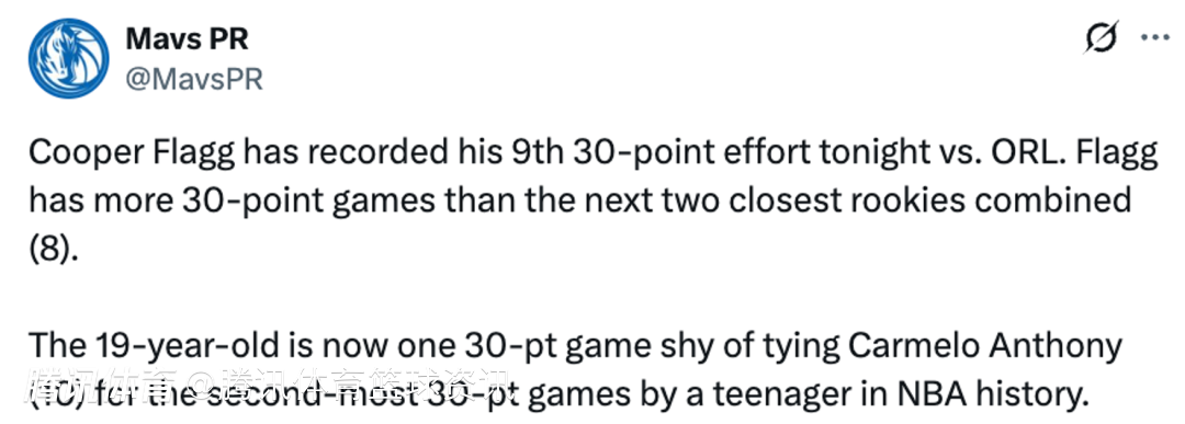 本场比赛仍在进行中,弗拉格已经拿到43分,这是他本赛季的第九场的30+得分,他的30+场次,比联盟里紧随其后的两名新秀加起来还要多(克努佩尔5次,埃奇库姆和贝利都是3次)。