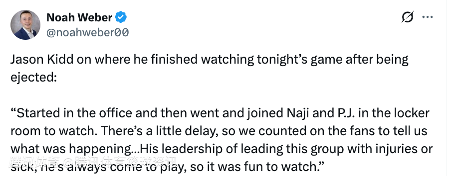 谈自己被驱逐后是在哪里看完比赛的,基德表示:“我先是在办公室看,后来又去更衣室和纳吉、华盛顿一起看直播。直播有延迟,我们只能靠现场球迷的喊叫声来判断场上发生了什么……他的领导力真的很棒,无论队友伤病还是生病,他总能站出来扛起球队,始终全力以赴。看他打球真的很过瘾。”