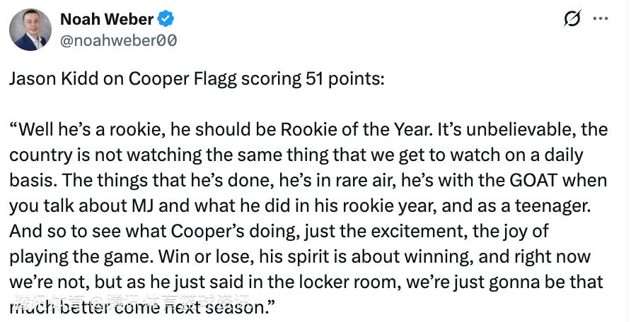 谈及弗拉格,基德表示:“他是个新秀,他就该拿年度最佳新秀。这太不可思议了,外界看不到我们每天在队内看到的东西。他做到的这些,已经是历史级的表现了;谈到新秀赛季、青少年球员的表现,他已经和乔丹站在同一高度。看库珀打球,能感受到那种纯粹的兴奋和热爱。无论输赢,他的骨子里都带着求胜欲。我们现在战绩还不够好,但就像他赛后在更衣室说的那样,下个赛季我们一定会变得更强。”