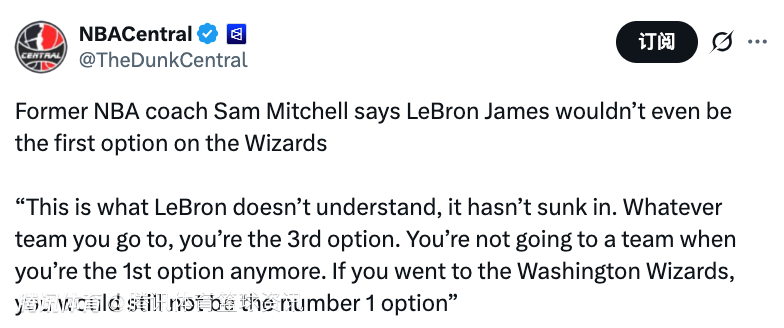北京时间12月28日,近期,前NBA教练萨姆-米切尔谈到了詹姆斯,他表示,詹姆斯在奇才队甚至都成不了第一进攻选择。