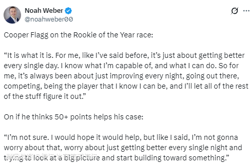 被问及砍下50+得分是否会为他竞选最佳新秀加分时,弗拉格表示:“我不确定。我希望这能有所帮助,但就像我说的,我不会去操心这些,我只关心每晚不断进步,着眼于长远大局,努力朝着一个目标去沉淀成长。”