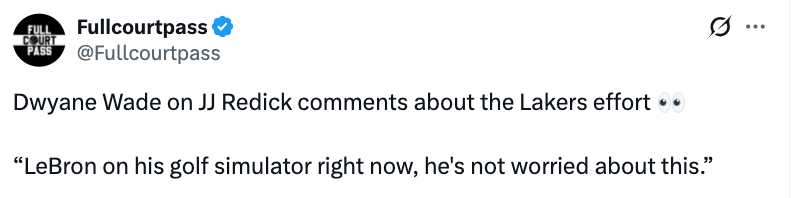 谈及雷迪克对湖人积极性的评价,韦德表示:“勒布朗现在正玩着高尔夫模拟器呢,他根本没把这事儿放在心上。”