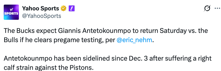 北京时间12月28日,据雄鹿队记Eric Nehm报道,字母哥预计将在今天对阵芝加哥公牛的比赛中伤愈复出、重返赛场。