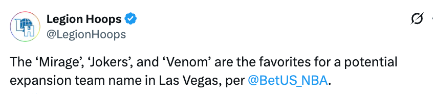 北京时间4月5日,据美媒账号BetUS NBA报道,“海市蜃楼(Mirage)”、“小丑(Jokers)” 和“毒液(Venom)”是拉斯维加斯潜在NBA扩军球队队名的热门候选。