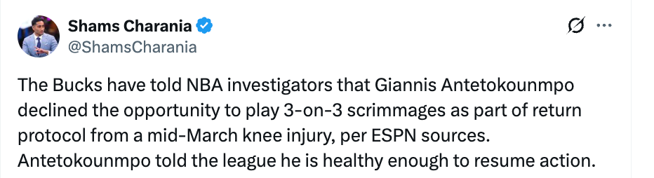 稍早前,Shams曾报道,联盟正在调查密尔沃基雄鹿队,原因是球队涉嫌违反球员参赛政策,且在字母哥的健康状况上存在前后说法不一的问题。字母哥与雄鹿队在接受联盟调查时给出了完全不同的说法:雄鹿方面向NBA表示,他们认为字母哥并未准备好复出,但字母哥本人其实是想上场比赛的;字母哥则向NBA说明,他本人想要参赛,但球队拒绝为他出具医疗许可(不允许他上场)。