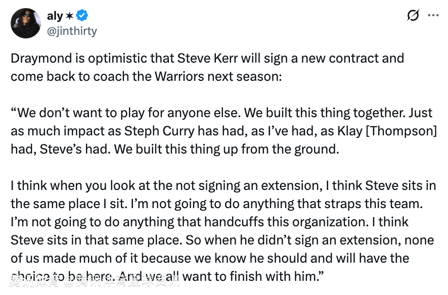 追梦对科尔下赛季继续执教勇士一事持乐观态度,他表示:“我们不想为其他任何人打球。这支球队是我们一起打造的。科尔的影响,和库里、我自己、克莱-汤普森的影响一样大。我们是从零开始,一步步把它建立起来的。”