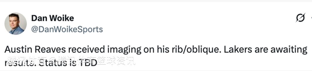 北京时间4月5日,据湖人队记Dan Woike报道,里夫斯已接受肋骨/侧腹部位的影像检查,湖人正在等待检查结果,他的出战状态目前待定。