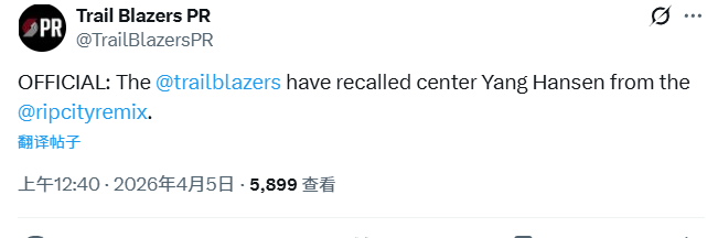 北京时间4月5日,开拓者官方宣布,球队已将杨瀚森从G联赛混音队召回。昨日结束的G联赛季后赛西部半决赛,混音95-107不敌卫冕冠军斯托克顿国王,杨瀚森17投9中得到20分7篮板2助攻2盖帽。随着混音被淘汰出局,杨瀚森本赛季的G联赛之旅也就此结束。
