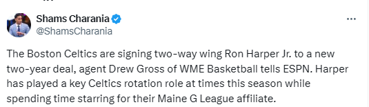 北京时间4月5日,据名记Shams报道,凯尔特人将把小罗恩-哈珀提拔至球队正式阵容,并与他签下一份为期两年的新合同。