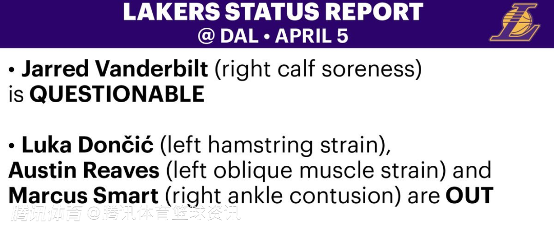北京时间4月5日,NBA常规赛继续进行,湖人明日对阵独行侠。赛前,湖人方面公布球队本场比赛伤情报告,东契奇、里夫斯和斯马特三人将缺阵。