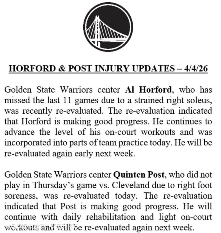 北京时间4月5日,勇士官方更新球队伤情公告,霍福德和波斯特接受复查,结果表明恢复进展良好。
