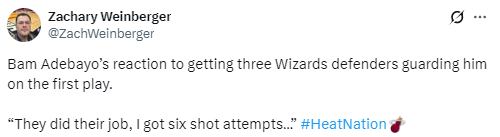 关于遭到奇才三名防守者包夹时的反应,阿德巴约打趣道:“他们做好了自己的本职工作,而我只获得了6次出手机会。”