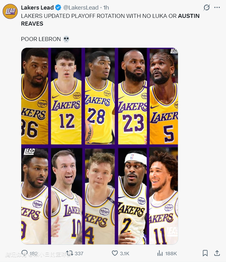 湖媒晒出了湖人队季后赛的潜在轮换:先发斯玛特、拉拉维亚、八村垒、詹姆斯、艾顿,替补布朗尼、肯纳德、克内克特、范德比尔特、海斯。