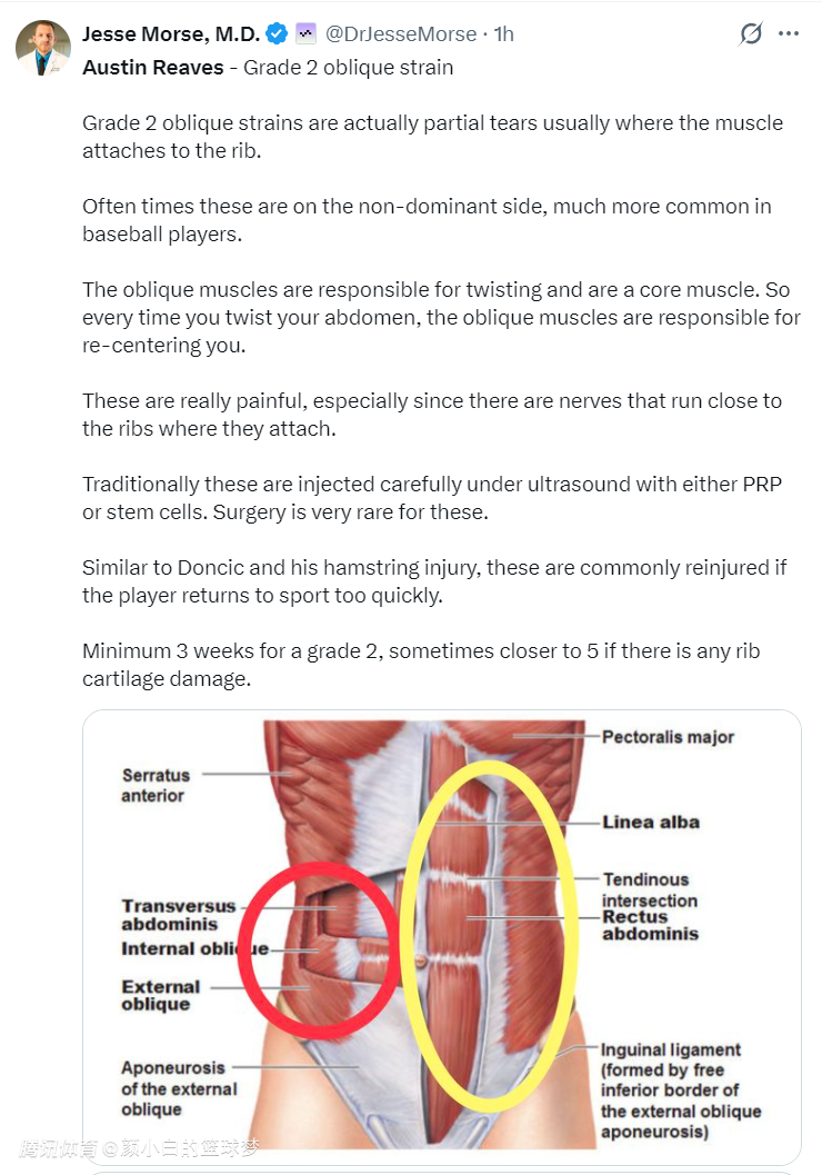 医学专家Jesse More详细的分解了里夫斯的伤情:腹斜肌二级拉伤,这种腹斜肌的拉伤是属于部分撕裂,这种情况通常发生在肌肉与肋骨的连接处,这种情况多出现在非主导的一侧,更多会出现在棒球运动员身上。