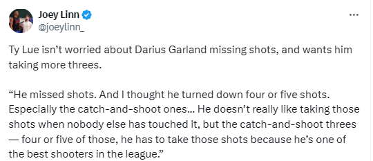 泰伦-卢并不担心球队核心加兰投篮失手,反而希望他多出手三分。泰伦-卢说道:“他投丢了一些球。而且我觉得他有四五次出手机会都放弃了,尤其是接球就投的机会。球还没经过其他人传导时,他不太愿意出手,但那些接球投三分——那四五次机会他必须出手,因为他是联盟最顶尖的射手之一。”
