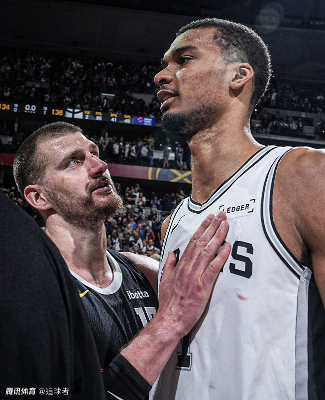 掘金和马刺苦战一个加时才分出胜负,第四节最后时刻,约基奇助攻戈登暴扣扳平比分,文班亚马错失绝杀,比赛进入加时赛;加时赛最后1分钟,约基奇两次迎着文班抛投得分,文班错失续命三分,最终掘金逆转取胜,赛后双方球员相互致意,约基奇轻拍文班亚马的胸脯。