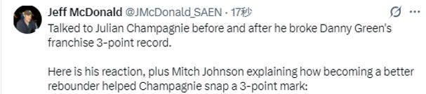 马刺主帅米奇-约翰逊也点赞了尚帕尼的表现,他说道:“他是那种极度渴望证明自己、情绪都写在脸上的球员,有时也会因为比赛结果大起大落。但即便投丢三四个球,他依然可以通过抢篮板、做好防守留在场上,正是这一点,让他获得了足够的出场时间,才有机会去冲击这样的纪录。”