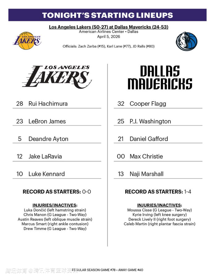 北京时间4月6日,NBA常规赛继续进行,湖人对阵独行侠。赛前,两支球队分别公布本场比赛首发阵容名单。湖人方面,詹姆斯单核带队,独行侠方面,弗拉格领衔出战。