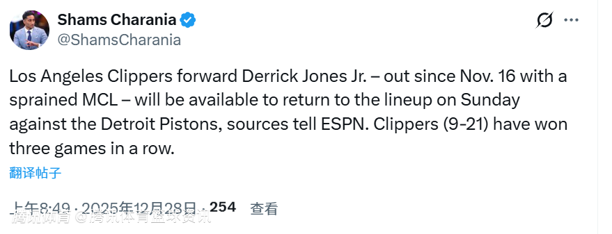 该记者写道:“据ESPN消息人士透露,自11月17日因内侧副韧带扭伤缺席的洛杉矶快船队前锋小德里克-琼斯,将在12月29日对阵底特律活塞队的比赛中迎来复出。目前快船队的战绩为9胜21负,已取得三连胜。”