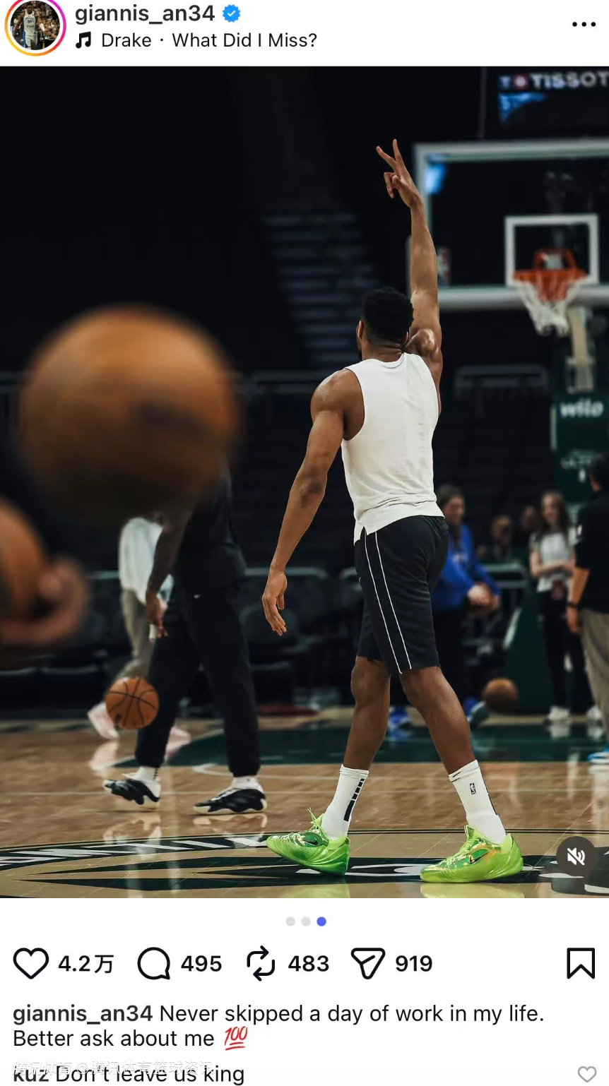 稍早前,字母哥更新IG晒出照片,并且写道:“我这辈子从来没有旷工过一天。尽管来打听我,百分百真实。”而库兹马也在底下留言写道:“别离开我们,国王。”