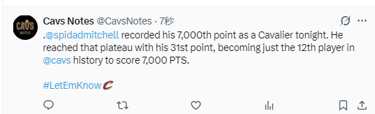 根据数据统计显示,这是米切尔本赛季第33次单场砍下30+,同时凭借本场比赛的第31分,他在骑士生涯的总得分突破7000分大关,成为了骑士队第12位队史总得分至少7000分的球员。