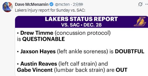 北京时间12月28日,湖人队公布了明日对阵国王队比赛的伤病报告,其中里夫斯和文森特两名球员缺阵。具体情况如下: