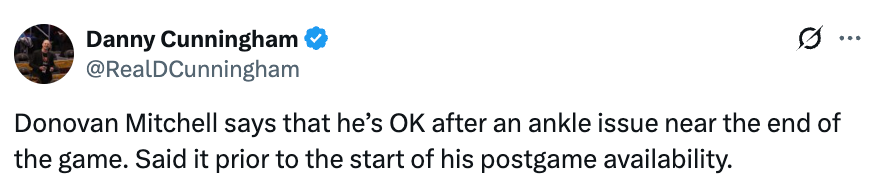 米切尔先是表示自己在比赛末段遭遇脚踝问题后并无大碍,随后他也谈到了本场比赛:“这段时间里你能看到,我们一直在尝试各种东西。显然有些场面看起来并不是特别流畅好看,但原因也很简单 —— 我们这套阵容整个赛季都没完整合体过。所以我们在进攻端、防守端都在不断试验,尝试不同阵容搭配,一边打磨战术,一边也让球员个人和整体都变得更好。”