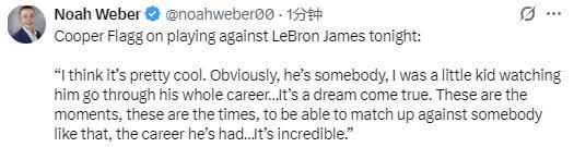 在谈到与詹姆斯交手的感受时,弗拉格说道:“我认为这很酷。在我小时候,我就看着他走过整个职业生涯。显然,首先光是看他打球就已经足够令人惊叹,看着他在场上依然能打出这样的表现。这对我来说简直是梦想成真。能和拥有如此传奇生涯的球员同场竞技,这样的时刻、这样的机会真的太难得了。他毫无疑问是史上最伟大的球员之一,这太不可思议了。”