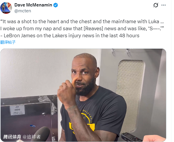 湖人输给独行侠赛后,谈到东契奇和里夫斯的接连受伤,詹姆斯表示:得知卢卡受伤,就像是当头一棒 直击我的心脏、胸膛和大脑。我午睡醒来看到里夫斯受伤的消息,心里直呼:‘完蛋了!’