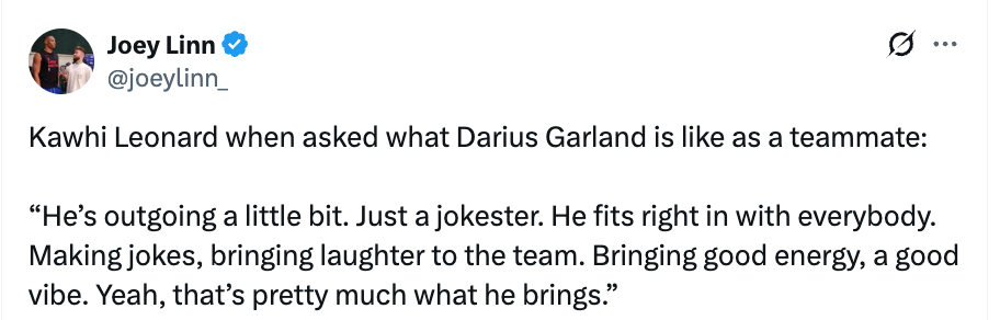 谈及加兰,小卡表示:“他算是比较外向吧,有点爱开玩笑的那种。跟所有人都合得来,会讲笑话,给球队带来欢乐,带来很好的能量和氛围。基本上他带来的就是这些。他跟我说,他会试着去匹配大家的能量,他很容易融入。不管是聊比赛,还是场下聊点搞笑的事,每个人都会参与进来。”