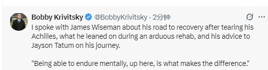 北京时间12月28日,步行者队球员怀斯曼接受采访,期间他向塔图姆分享了关于如何从跟腱断裂伤势中恢复的建议。