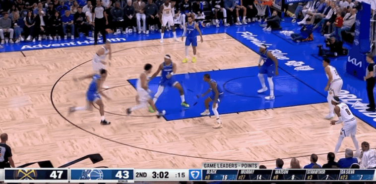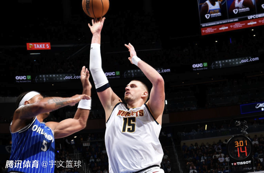 约基奇试图在进攻端掌控比赛,先是造成犯规罚球得分,随后转身单打得手,一人连得6分率队顽强迫近分差。但是掘金除约基奇和穆雷以外能给到的支援太少,让魔术持续占据赛场主动权。虽然约基奇遭到严防,进攻手感并不好,但是他能把握前场篮板完成二次进攻,持续获得罚球机会追分。